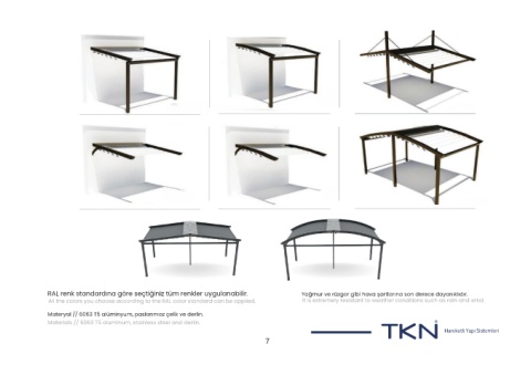 RAL renk standardına göre seçtiğiniz tüm renkler uygulanabilir. Yağmur ve rüzgar gibi hava şartlarına son derece dayanıklıdır.