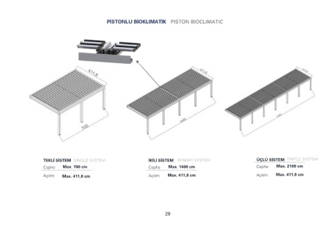 PİSTONLU BİOKLIMATİK PISTON BIOCLIMATIC TEKLİ SİSTEM SINGLE SYSTEM İKİLİ SİSTEM BINARY SYSTEM ÜÇLÜ SİSTEM TRIPLE SYSTEM Cephe Max. 700 cm Cephe Max. 1400 cm Cephe Max. 2100 cm Açılım Max. 411,8 cm Açılım Max. 411,8 cm Açılım Max. 411,8 cm 29
