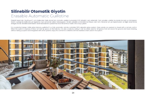 Patentli tasarımdır. Giyotinyum®, cam balkondan farklı olarak tam otomatik, uzaktan kumandalı %100 silinebilir cam sistemidir. Cam paneller, uzaktan kumanda ile açılır ya da kapanır.